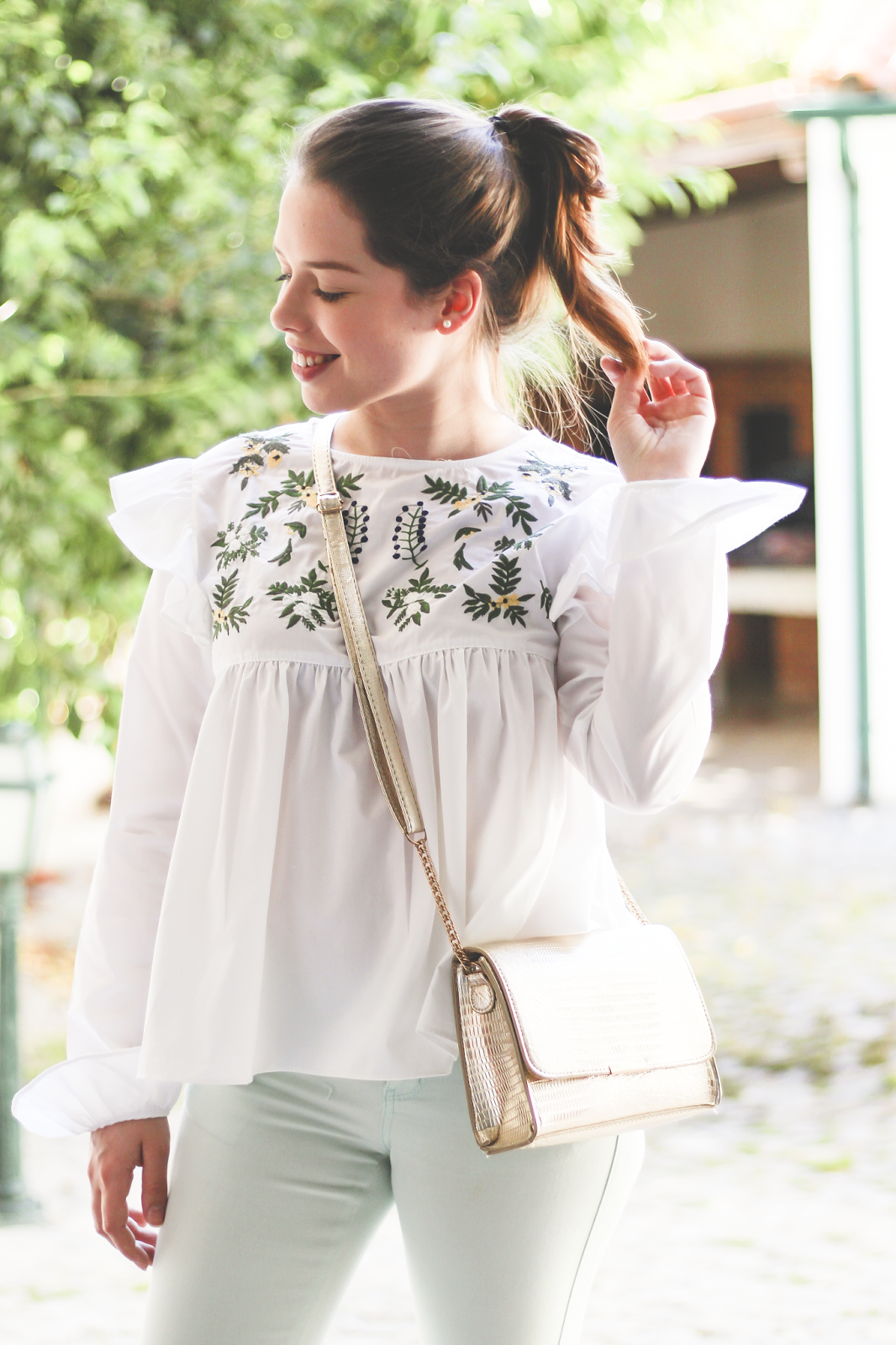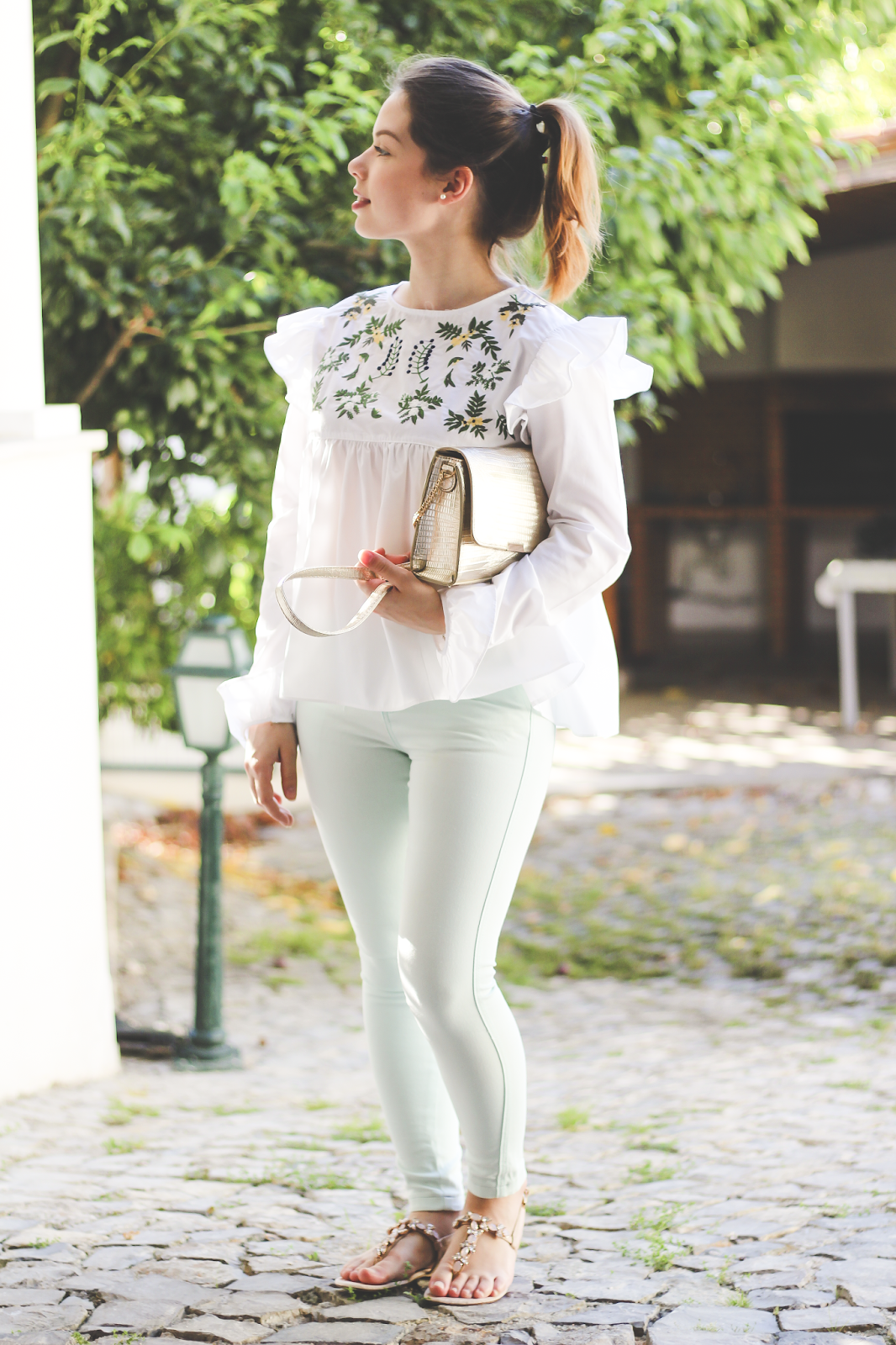 Uau, inédito! Um novo outfit no blog! É verdade, malta, e perdoem-me por isso. Hoje, ao voltar do trabalho deu-me qualquer coisa e decidi chamar o meu irmão para me fotografar. Já é difícil, para mim, arranjar tempo (e vontade, confesso) e quando arranjo ele ainda fica aborrecido por ter de me fotografar - diz que sou muito chata e que tiro quinhentas fotografias para aproveitar nove ou dez. True that. E saber que estamos a obrigar alguém a fazer o que não gosta e não quer também desmotiva e faz-nos "perder a coragem" de pedir. O que vale é que mesmo contra a vontade, com jeitinho, a coisa vai lá. Hoje apeteceu-me vestir-me fresquinha pelo que decidi colocar no corpo, pela primeira vez, a minha blusa nova da Zaful - que, modestia à parte, acho que fica linda! - e umas calças verde menta. Confesso que as adoro e raramente as visto porque são uma cor de verão mas, para verão, estão demasiado justas. Enfim! Para completar decidi juntar uma malinha dourada e as minhas sandálias novas - com pouco mais de uma semana de uso - que comprei dado a necessidade de um par de sandálias mais "normal" e que desse com tudo.